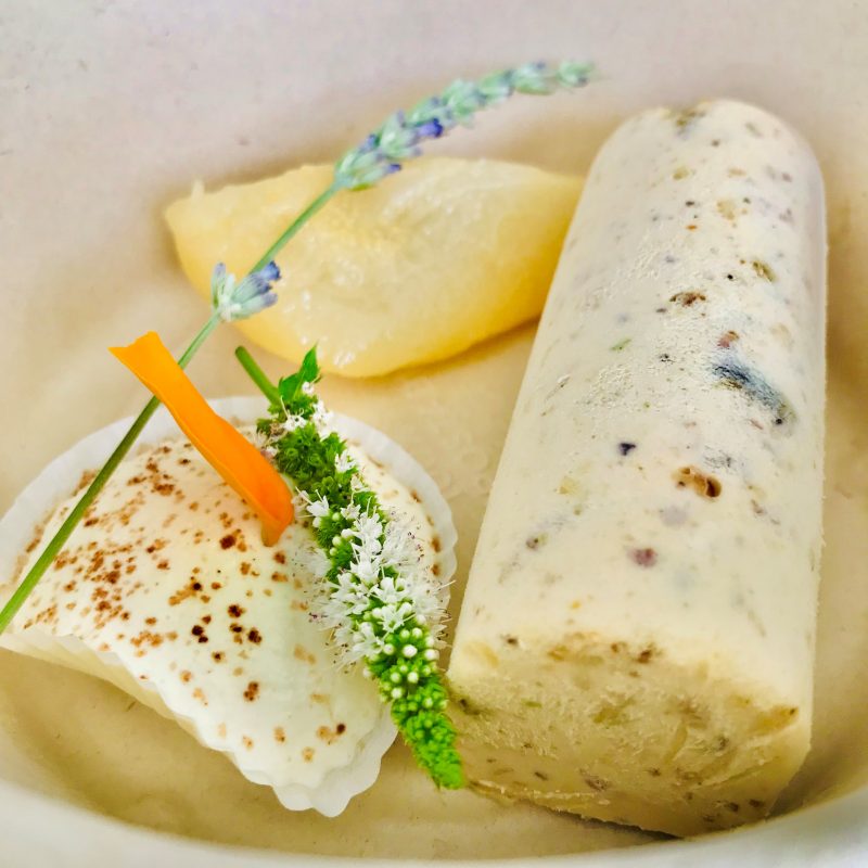 Tartelette à la rhubarbe du jardin, petit retour à la douce enfance en campagne. Elle est composée de la compotée de rhubarbe de notre potager permaculture, d’une crème d’amande gourmande et des lamelles de rhubarbe rôties légèrement acidulées qui viennent contrebalancer le tout.