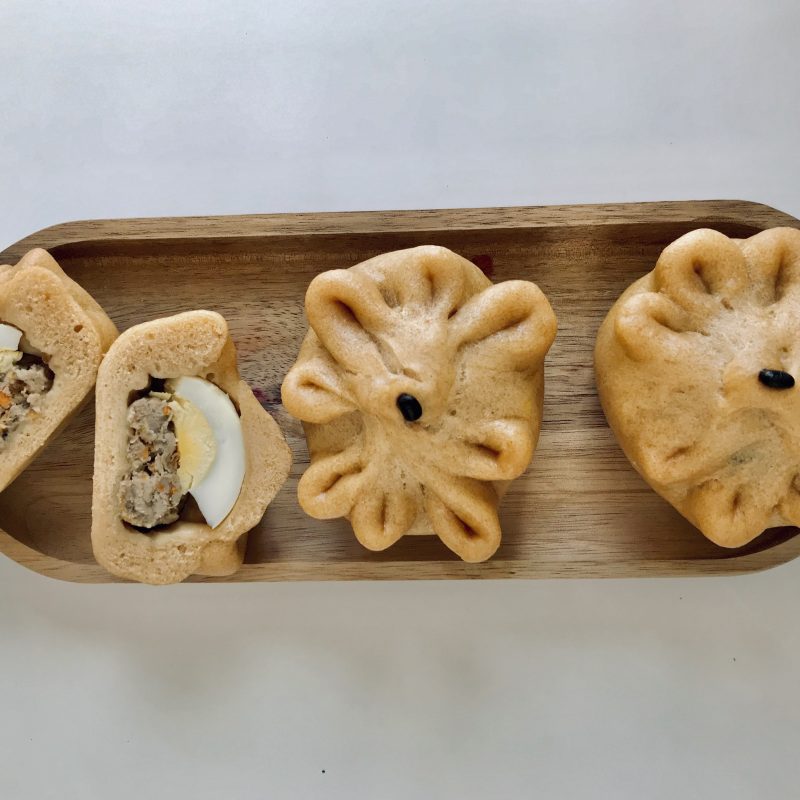 Cette brioche salée est composée de la farine bio de type bise, cultivée dans les Alpes chez Jean-Louis Filly à la ferme Mélanie, levée au levain maison naturel. Elle bénéficie de la cuisson douce à la vapeur. Sa farce est composée de filet de porc, ail, chanterelles sauvages cueillies par nos soins, œuf, sauce soja et poivre.